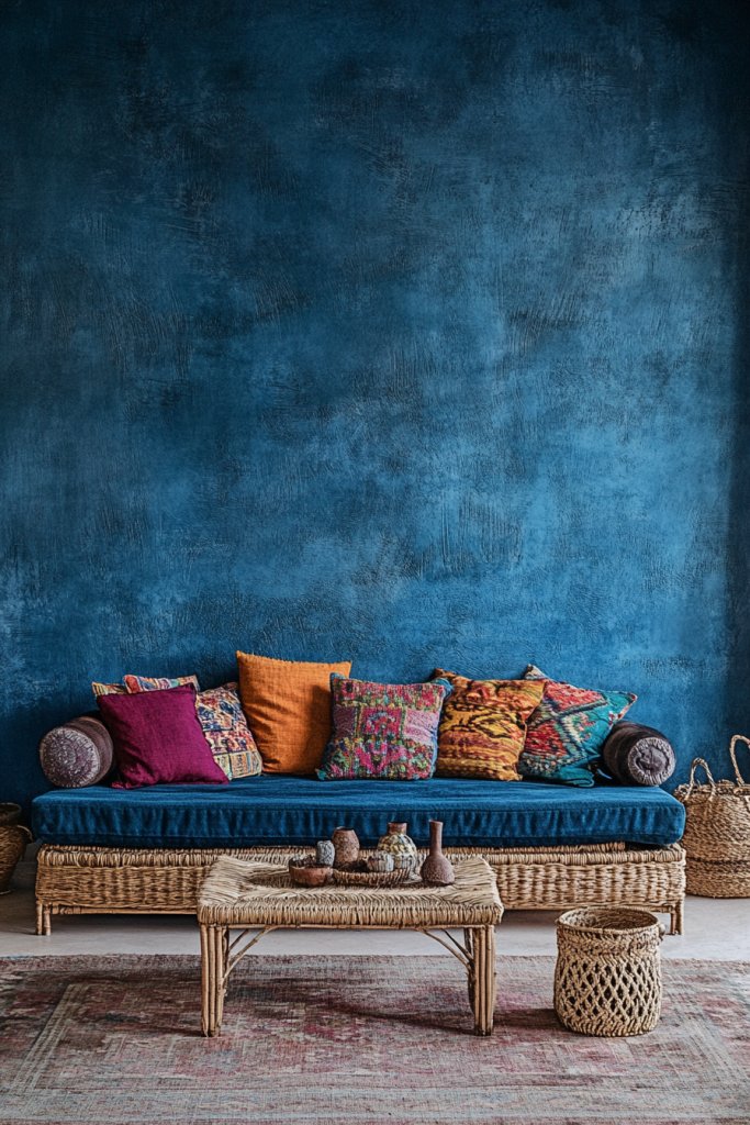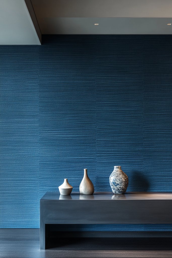 Envision a feature wall in a deep matte blue, textured with plaster or stucco. The rough surface catches light differently throughout the day, adding subtle shadows and dimension. Complement this with smooth, minimalist furniture and soft textiles to contrast textures. The overall effect is modern, elegant, and deeply tactile.