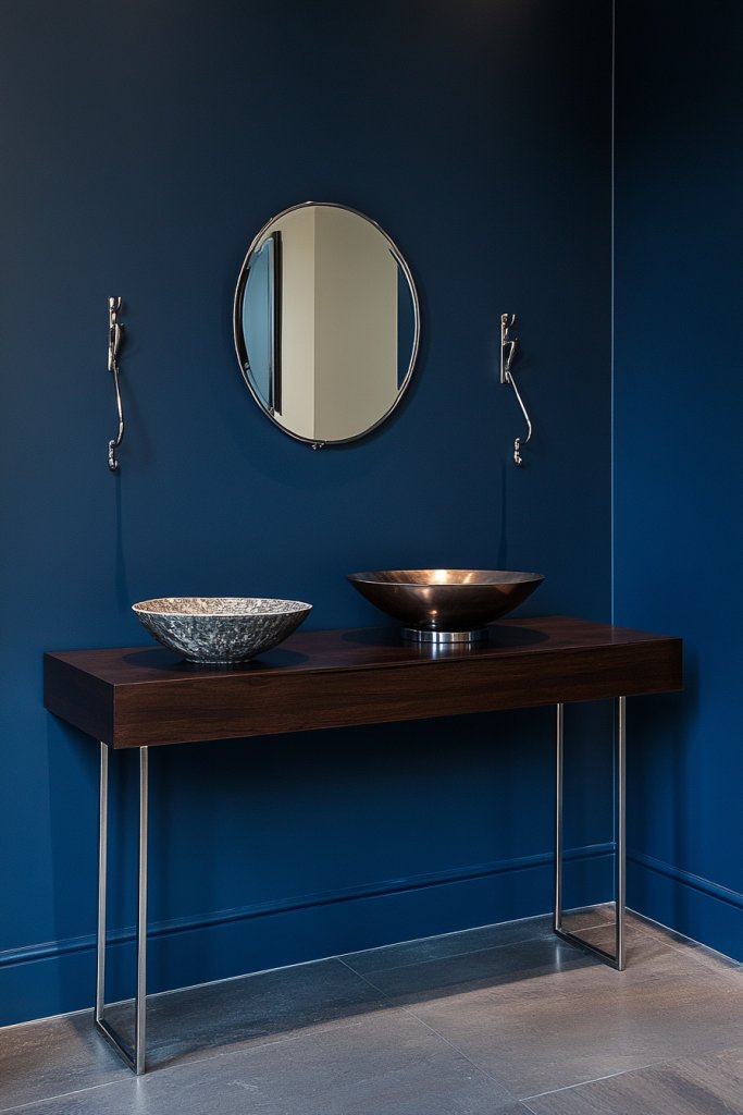 Picture a narrow entryway with a deep blue ink wall accented by a sleek console table and a statement mirror. The rich hue creates a striking backdrop that contrasts beautifully with light-colored flooring and accessories. Minimalist decor, like sculptural items or textured rugs, enhances the modern, artistic vibe. The space feels inviting yet impactful, making every arrival memorable.