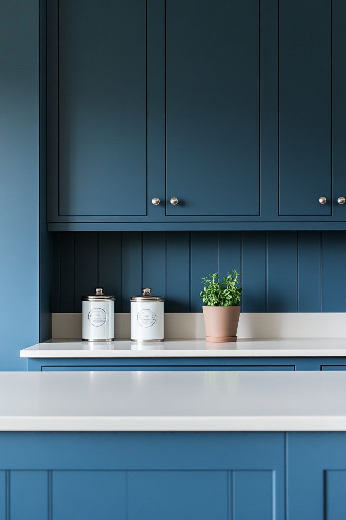 Visualize a kitchen with deep navy or slate blue cabinets paired with rustic wood countertops and open shelving. The dark hue grounds the space while contrasting beautifully with lighter elements like white subway tiles or cream-colored walls. Warm lighting highlights the richness of the blue, creating a welcoming atmosphere. Textured ceramics and vintage accessories add charm and authenticity.