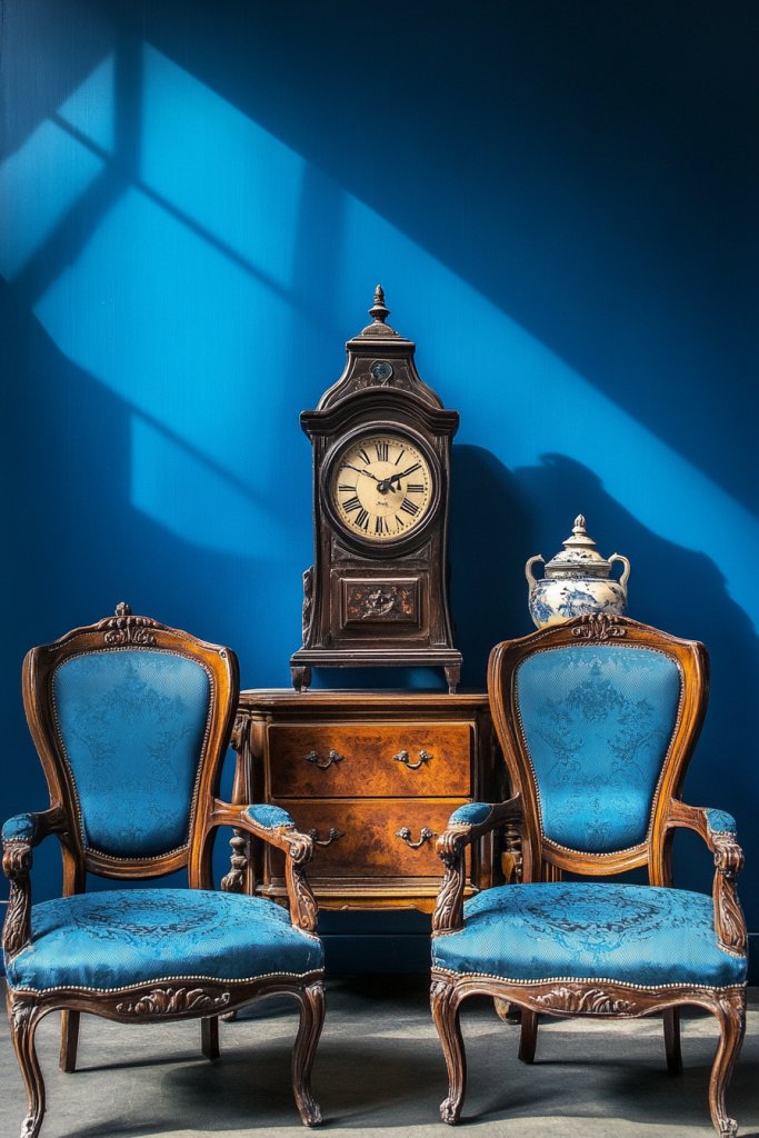 Imagine a living room with a deep, shadowy blue wall paired with vintage furniture—think tufted armchairs and distressed wooden tables. Antique brass or bronze fixtures add warmth and contrast. Soft lighting highlights the rich, moody tones, while patterned textiles and vintage accessories complete the look. The result is a cozy, nostalgic space with a contemporary edge.