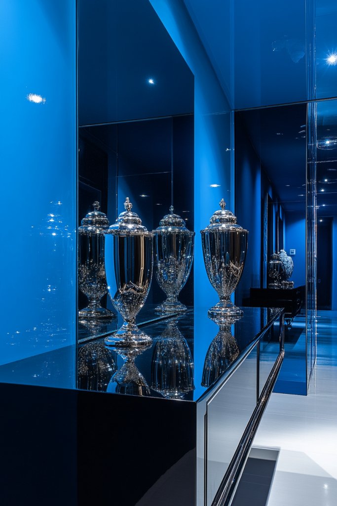 Incorporate reflective blue with minimalist furniture and metallic accents—like chrome or gold—to amplify the glamour. Use textured or matte finishes on furniture to contrast with the high-gloss walls. For a softer touch, layer with plush textiles or neutral decor pieces. Seasonal updates can include changing lighting styles or accessories to shift the mood.