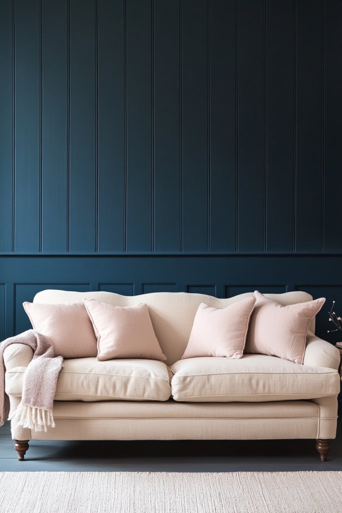 Imagine a living room with a navy accent wall, complemented by cream-colored furniture and blush textiles. The soft neutrals tone down the depth of the blue, creating a layered, harmonious environment. Warm lighting enhances the balance, making the space feel cozy and sophisticated. Subtle textures like plush cushions and woven throws add depth without competing with the moody blue.