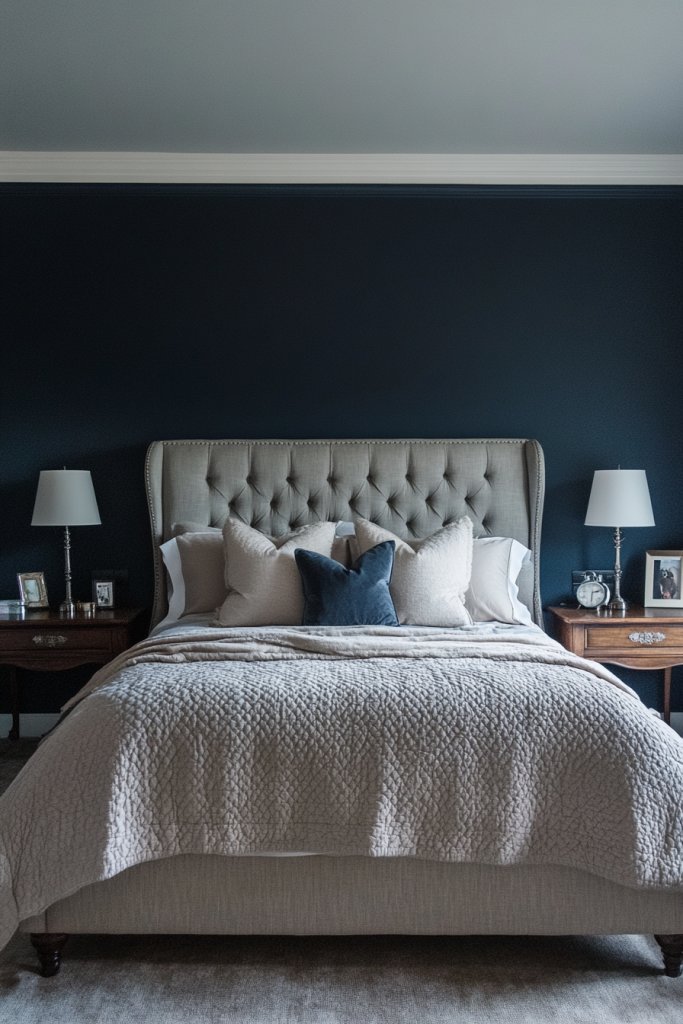 Imagine sinking into your bed under a deep blue wall with subtle charcoal undertones. The dark hue absorbs ambient light, enhancing the feeling of intimacy. Soft, plush bedding in warm neutrals and textured blankets accentuate the calming atmosphere. Dim, warm lighting enhances the depth of the color, making your space feel like a luxurious sanctuary.
