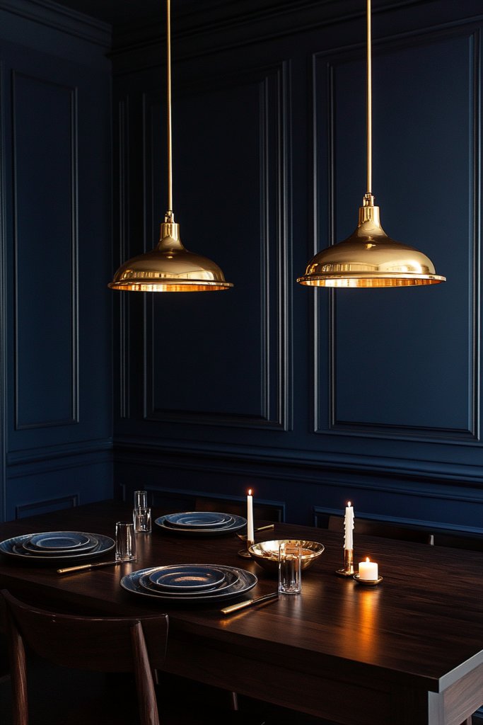 Picture a dining nook with navy walls and a sleek wooden table. Gold pendant lights hang overhead, casting a warm glow that highlights the richness of the navy. Gold-rimmed dinnerware, candlesticks, or decorative bowls add shine and contrast. The overall effect is a refined yet welcoming space perfect for entertaining or intimate dinners.
