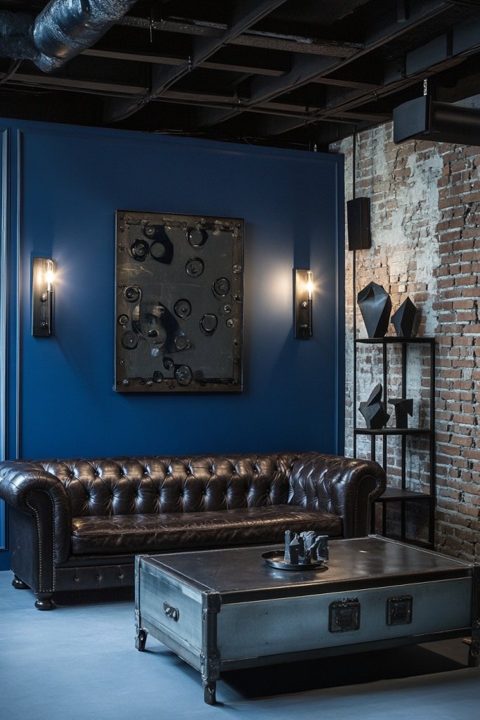 Visualize a space with exposed brick walls, metal fixtures, and a deep blue accent wall. A leather sofa and reclaimed wood furniture complement the blue’s cool undertones. Industrial lighting fixtures with matte black finishes cast warm pools of light that soften the overall aesthetic. Textured rugs and metal accents complete the curated, rugged vibe.