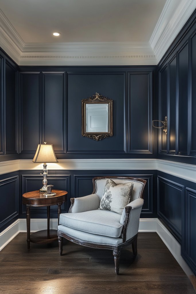 Pair dark blue paneling with light, neutral walls for a balanced contrast. Use ornate moldings or beadboard for added architectural detail. Incorporate metallic accents—like gold or brass—for a luxurious touch. In transitional spaces, combine traditional paneling with modern furniture and accessories for a balanced aesthetic. Seasonal decor can include textiles or art that add color pops without overshadowing the paneling.