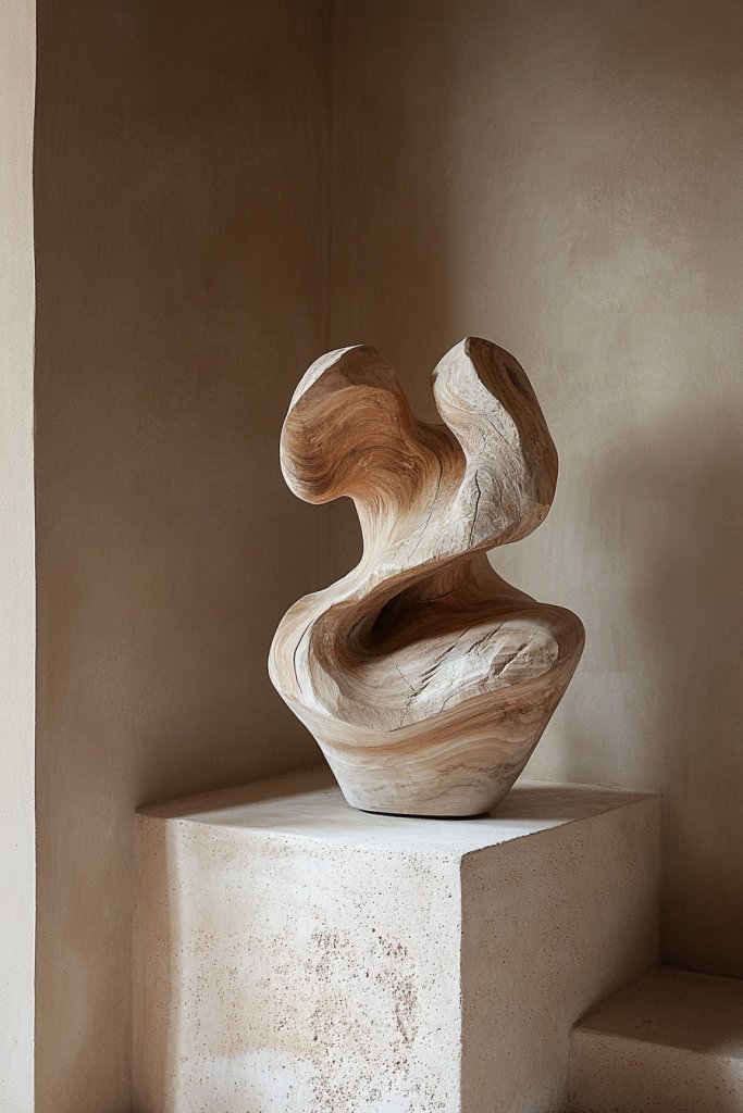 Visualize a wall adorned with handcrafted sculptures resembling leaves or flowing water. Organic-shaped ceramics or driftwood art pieces sit on shelves or tables, inviting touch and admiration. The natural curves and textures create a visual rhythm that mimics the outdoors. These art pieces tell stories of craftsmanship and nature’s beauty.