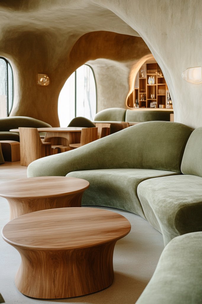 Imagine a coffee table with rounded edges carved from smooth, natural wood, inviting you to rest your hands. Curved shelving and rounded furniture pieces create a visual rhythm that guides your eye effortlessly around the room. Soft, flowing lines on textiles or architectural details echo natural contours, adding a sense of calm and unity. The overall effect is a space that feels alive and organic.