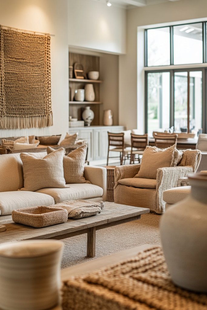 Picture a living room with a jute rug under your feet, its rough texture grounding the space. Toss a linen throw over your sofa, its natural fibers catching the light and inviting you to touch. Soft cotton or hemp cushions add comfort and visual interest, contrasting with sleek furniture. The tactile richness of these materials makes the room feel layered and authentic.