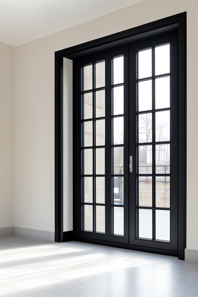 Imagine sleek black window frames with expansive glass panes revealing your view or letting in natural light. The matte black finish absorbs glare and frames the outside world sharply. Interior doors painted in matching black create a seamless, sophisticated boundary. The contrast between black and white or neutral walls intensifies the room’s depth and structure.
