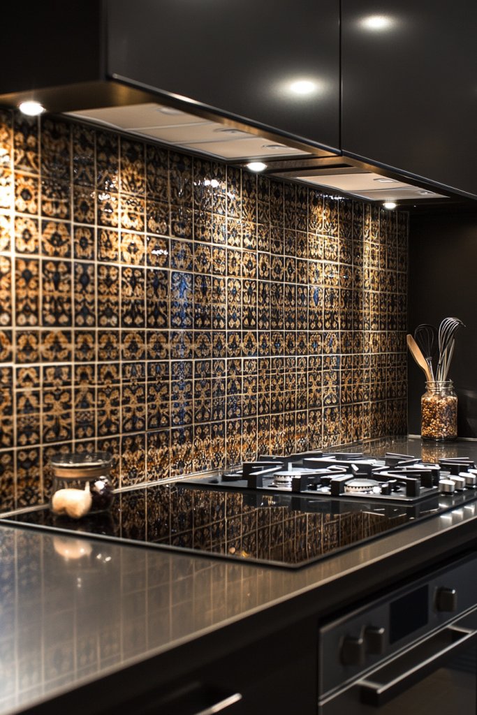 Incorporate metallic or textured grout to add subtle contrast. Use decorative border tiles or trims to frame the backsplash. Add personal touches with custom-shaped tiles or a contrasting border in lighter shades. Keep the surrounding cabinets and counters simple to let the dark backsplash shine.