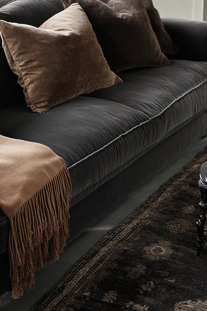 Mix textures in upholstery, pillows, rugs, and curtains for a layered look. Use dark neutrals in both modern and rustic settings, balancing with lighter accents or metallic details. Seasonal updates include swapping textiles for lighter or heavier options, depending on the weather. Keep the color palette cohesive to ensure harmony across all elements.
