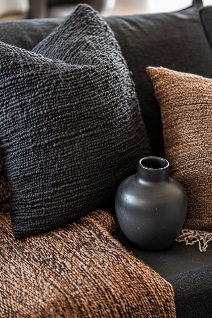 Imagine combining matte black, suede, linen, and woven fabrics in shades of dark brown, charcoal, and black. These textures catch light differently, creating subtle shifts in tone and mood. A velvet cushion, a wool throw, and a matte-finished wooden side table work together to craft a multidimensional aesthetic. It’s like a symphony of textures that makes your eyes want to explore.