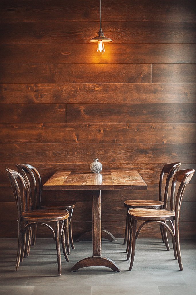 Accent with LED strip lighting behind panels for a warm glow or install decorative corbels and trim for a custom crafted feel. Introduce textiles like a soft cream throw blanket with chunky knit texture to soften the look. Incorporate vintage or artisan accessories to enhance the rustic vibe. Consider contrasting the dark wood with lighter upholstery or painted furniture for a balanced aesthetic.