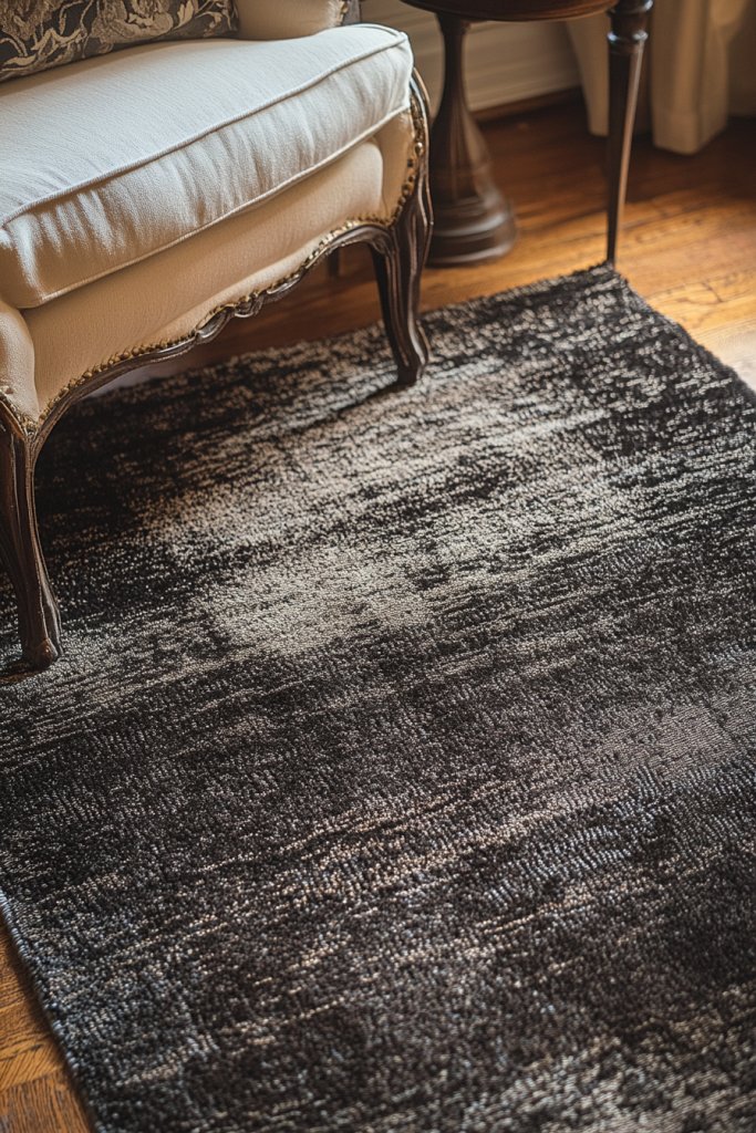 Picture a plush rug in deep charcoal, dark brown, or even black with textured patterns like braided, shaggy, or geometric designs. The tactile surface invites your feet to sink in, creating comfort and luxury. The subtle patterns catch the light differently, adding depth and dimension. It’s like a wearable piece of art that grounds your entire room.
