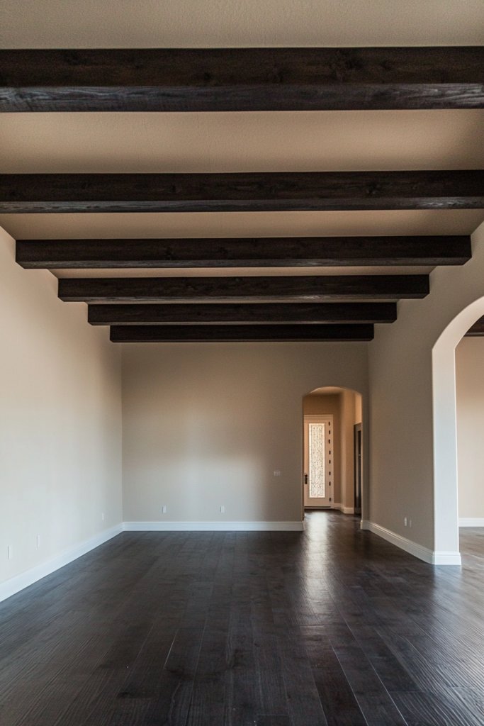 Imagine exposed beams in a deep walnut or ebony stain running across a high ceiling. The rich, dark wood contrasts beautifully with lighter walls or ceilings, creating a layered, dimensional look. It gives a space a cozy yet grand feel—like a mountain lodge or rustic estate. The beams also frame the room, guiding your eye upward and emphasizing height.