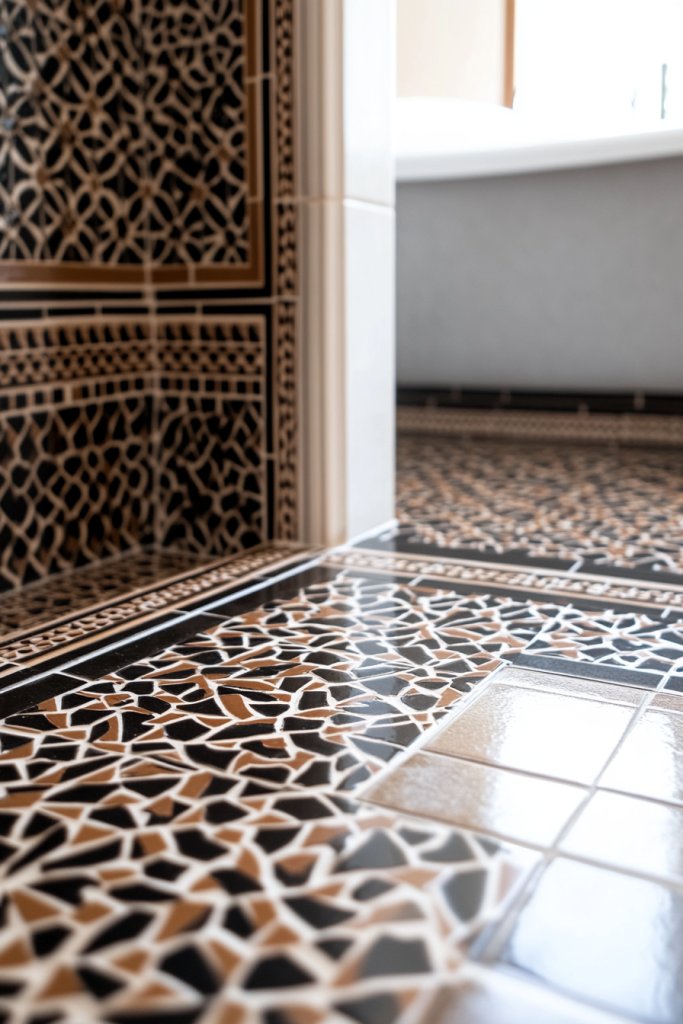 Want to make a bold statement in your bathroom or entryway? Black and brown tiles with intricate patterns can turn ordinary spaces into eye-catching features. They add a layer of sophistication and depth that’s hard to beat. If you love geometric or herringbone designs, this idea is a game-changer.