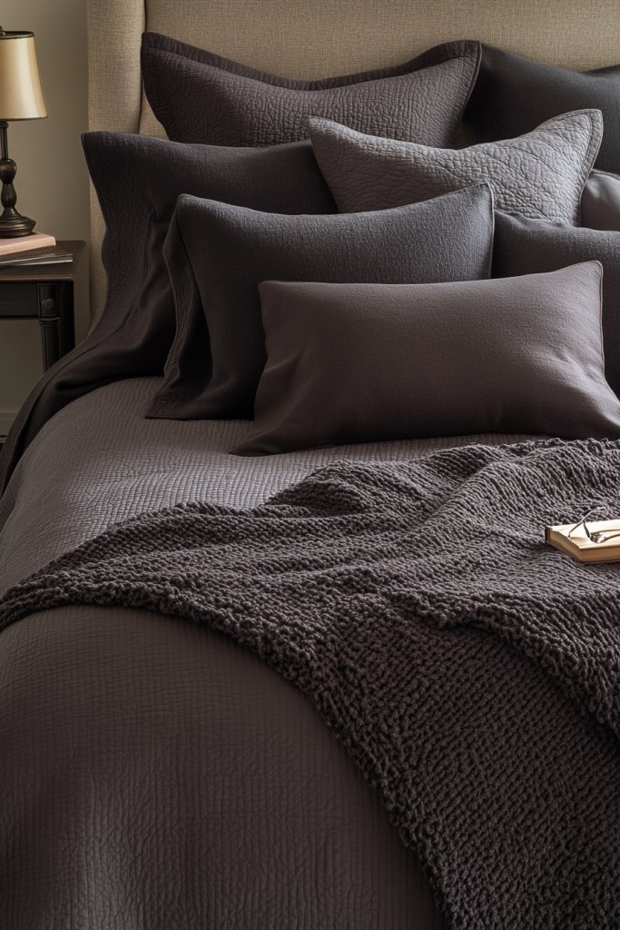 9. Charcoal and Cocoa Layered Bedding for Restful Elegance