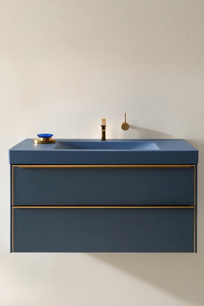 This concept adapts to various styles—go for a minimalist, handleless look or add decorative gold pulls for a touch of ornate detail. The blue can be matte, gloss, or textured, depending on your taste. In small bathrooms, a slim profile works best; larger spaces can accommodate wider, double sinks with matching gold fixtures. Seasonal updates might include changing hardware finishes for different effects or adding decorative elements like textured panels.