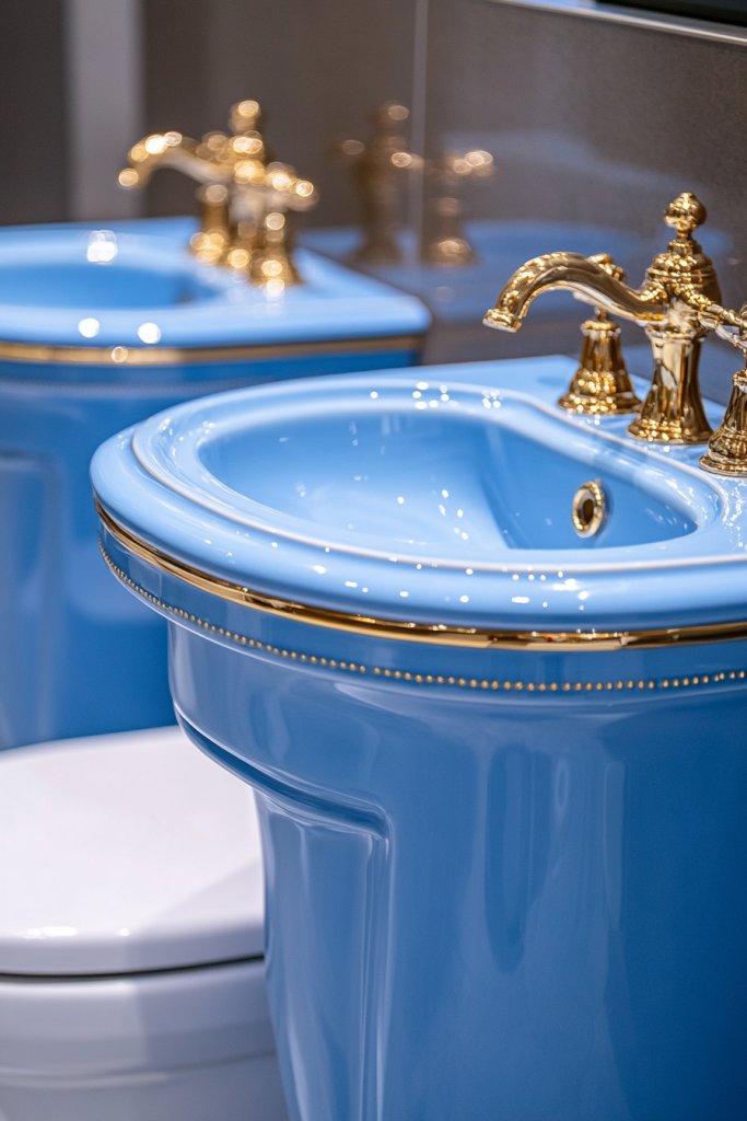 Imagine a beautiful blue porcelain sink or toilet with delicate gold accents—perhaps gold trim around the edges or gold detailing on the handles. The glossy blue surface adds a vibrant pop of color, while the gold highlights bring in luxe sophistication. When paired with matching accessories and soft lighting, the fixtures become statement pieces that redefine your bathroom’s style. It’s a perfect blend of old-world charm and modern elegance.