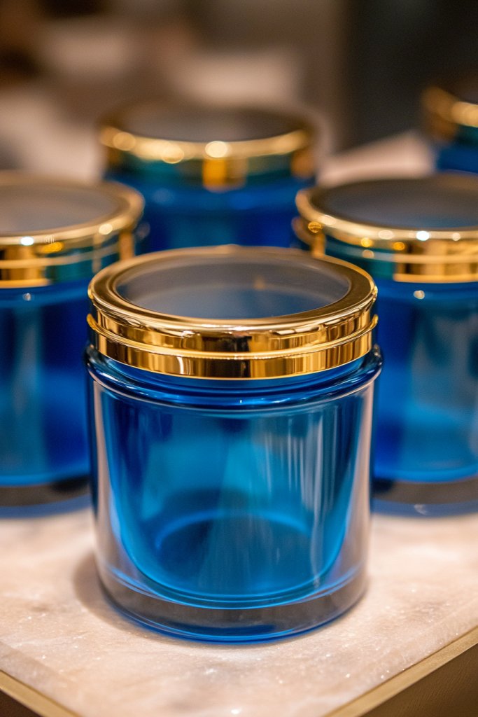 Picture a set of beautiful blue glass jars with sleek gold-lined rims—perfect for storing cotton balls, bath salts, or brushes. The transparent glass lets you see the contents, while the gold trim adds a touch of glamour. When arranged neatly on a shelf or vanity, they create a cohesive, sophisticated display that feels intentional and high-end. The shimmering gold accents catch the light, elevating your entire space.
