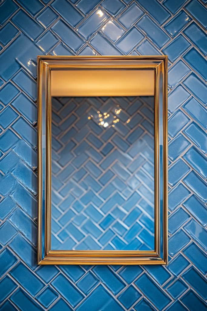 Picture a large, ornate gold mirror with intricate detailing framing a vibrant blue tiled wall. The tiles are glossy and deep, creating a rich backdrop that highlights the mirror’s brilliance. When light hits the gold frame, it radiates warmth and luxury, making the entire wall pop. The combination of shimmer and shine transforms a simple bathroom into a space that feels curated and high-end.