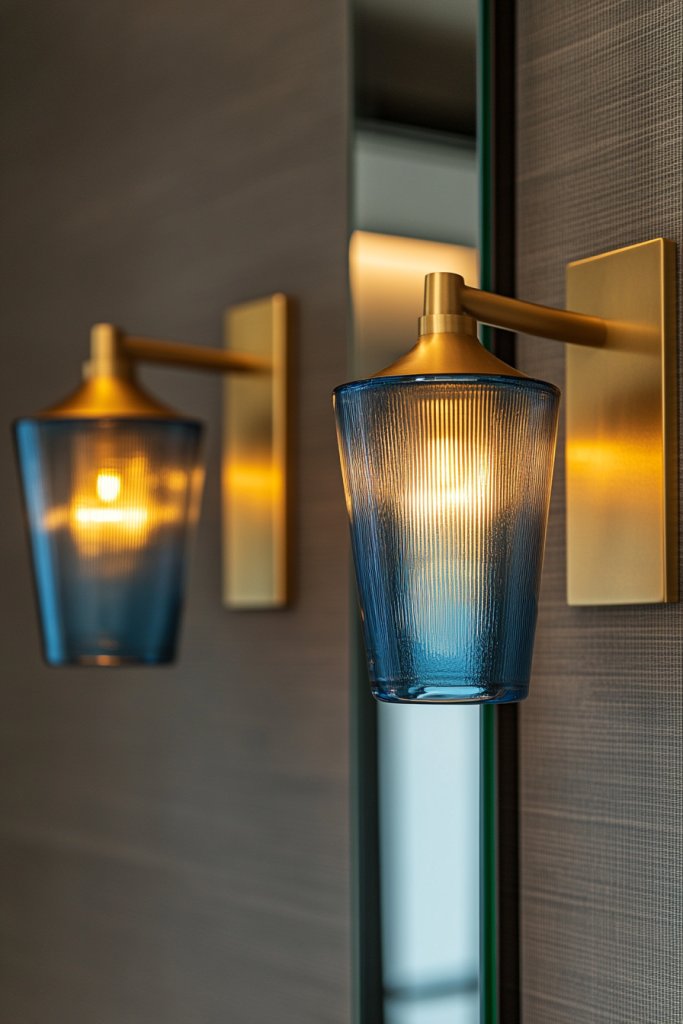Imagine a pair of gold-finished wall sconces with blue glass shades flanking your mirror. The shades diffuse light softly, casting a warm, flattering glow that makes your skin look amazing. The gold finish adds a touch of opulence, catching the light and reflecting subtle hues of blue and gold around the room. When turned on, these fixtures create an ambiance that’s cozy, luxurious, and inviting.