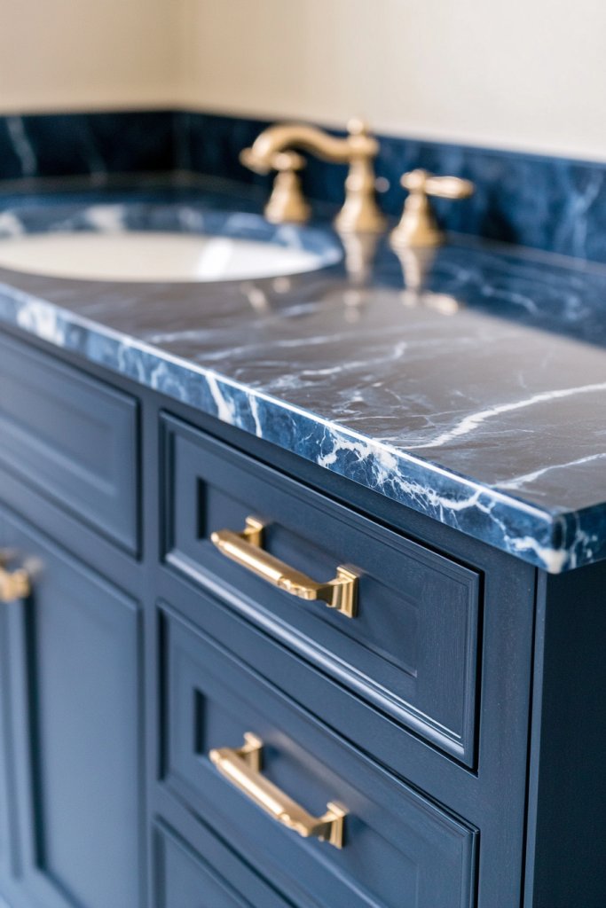 Envision a sleek blue marble countertop with swirling patterns of navy, cobalt, and hints of white. Gold hardware, like faucet handles and cabinet pulls, contrast beautifully, adding a rich glow that elevates the entire vanity. The polished surface reflects ambient light, giving your bathroom a bright, airy feel. It’s the perfect blend of sophistication and functionality, making your daily routine feel like a luxury ritual.