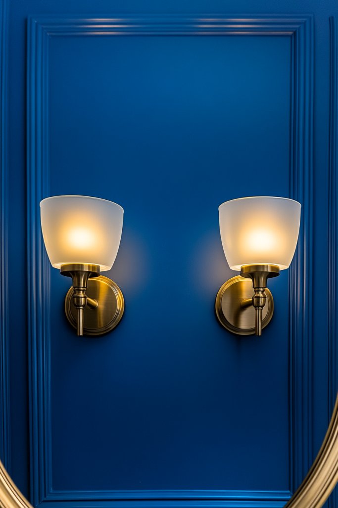 This setup can be tailored to different decor styles—go for sleek, minimalist gold sconces for contemporary spaces or ornate, vintage fixtures for classic charm. The blue paint can be matte or satin, depending on how much sheen you want. For a more playful look, combine different shades of blue or add subtle metallic accents on the walls. Adjustable sconces allow you to control the lighting intensity, making it perfect for different times of day or moods.