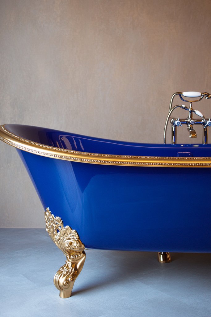 Imagine a vintage-inspired clawfoot tub painted a deep, rich blue with subtle marble-like veining. The edges are trimmed with elegant gold detailing, accentuating its curves and giving it a royal feel. Soft ambient lighting reflects off the glossy surface, making it look inviting and indulgent. The gold trim catches the eye, turning a simple fixture into a statement of opulence.