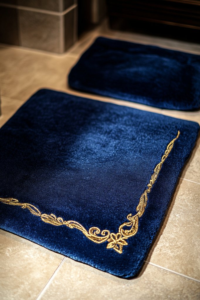 A plush blue velvet rug with gold accents transforms your bathroom into a chic oasis. It’s a simple upgrade that adds texture and color, making your space much more inviting. Plus, it’s a detail that shows off your personal style and eye for luxury. Ready to step into a softer, more elegant bathroom? It’s easier than you think—and totally worth it.
