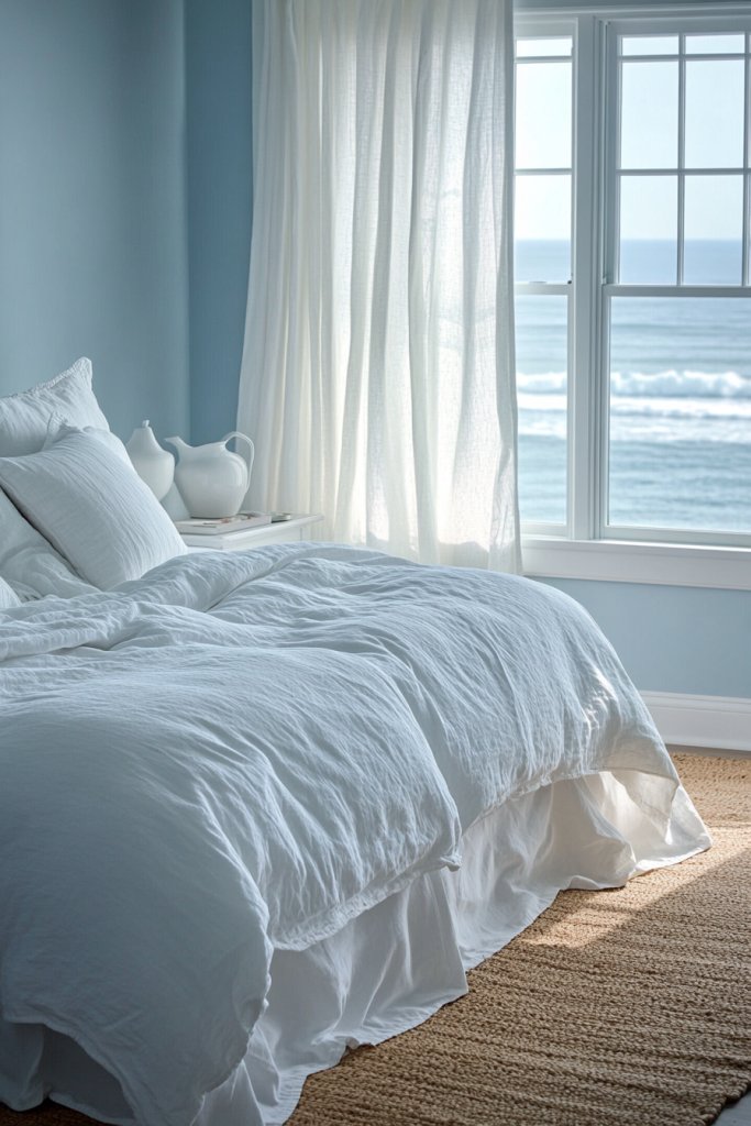 Imagine soft, pale blue walls that mimic the sky, paired with crisp white linen bedding that feels cool and inviting. The texture of linen adds a relaxed, breezy vibe, while nautical accents like subtle rope details or driftwood-inspired decor complete the scene. Light filters in gently through sheer curtains, casting a soft glow that makes the entire space feel airy and open. It’s like a breath of fresh sea air, right inside your home.