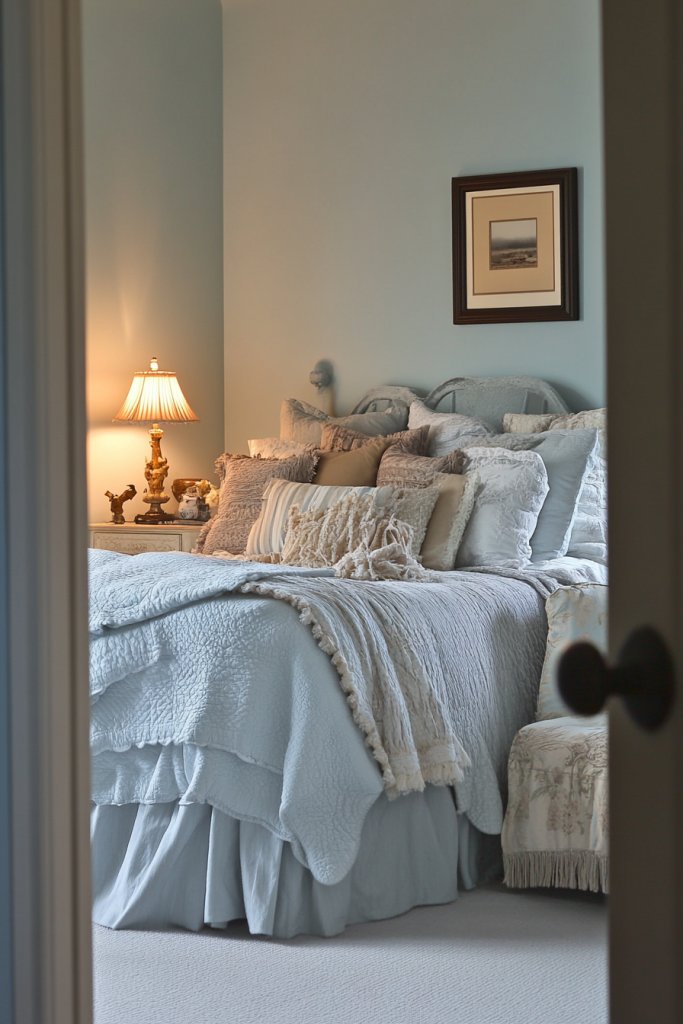 10. Pale Blue Guest Room with Cozy Layered Bedding and Warm Lighting