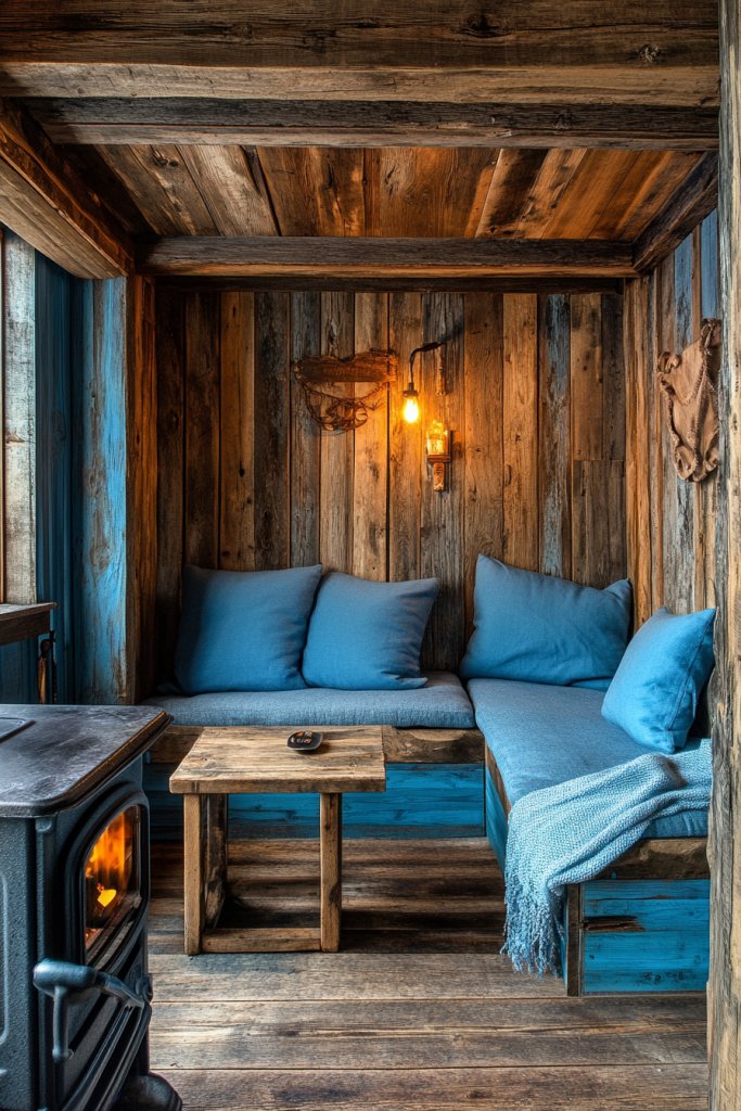 Visualize weathered reclaimed wood walls paired with soft, powder blue textiles and accents. The rough texture of the wood contrasts beautifully with plush cushions or throws in light blue shades. Rustic fixtures and handcrafted details add authenticity, while soft lighting enhances the cozy atmosphere. The overall look is warm, inviting, and full of character—like a true mountain getaway.