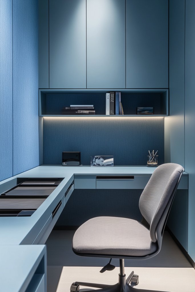 Picture a sleek, compact workspace with pale blue walls that soothe the mind. Functional shelving and storage keep clutter out of sight, while a simple desk in a matching or contrasting color anchors the space. Minimalist decor, a comfortable chair, and a few organizational accessories create a tidy, inviting environment. Soft lighting and clean lines make it feel modern and efficient—like a sanctuary for productivity.