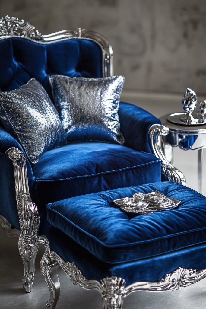 Visualize a deep blue velvet sofa or armchair that invites you to sink in, contrasted with shiny silver legs or decorative trims. Soft lighting from sconces or small lamps highlights the lush fabric and metallic details, adding shimmer and depth. Pair it with plush cushions and textured throws in similar shades for a layered, inviting look. The overall effect is opulent yet cozy, with a timeless appeal.