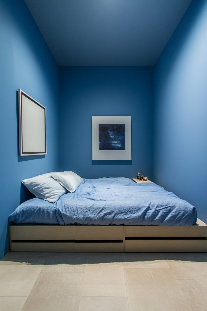 14. Minimalist Blue Bedroom with Hidden Storage and Neutral Floors