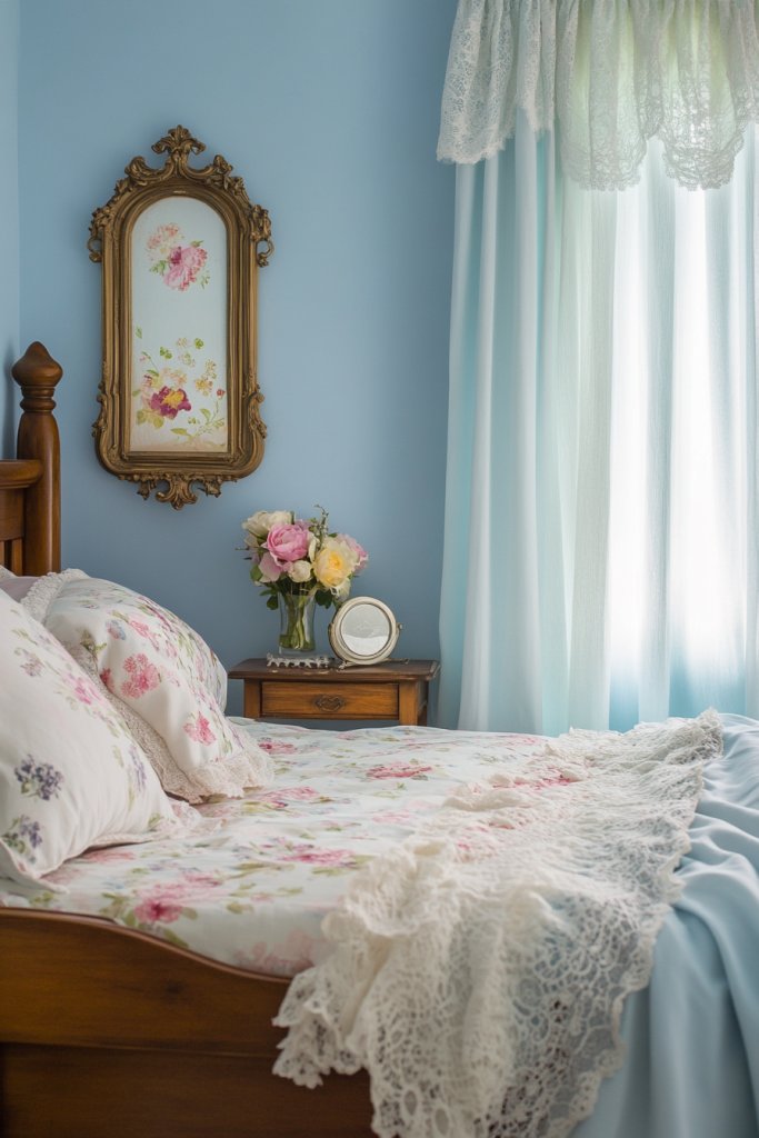 Picture soft blue walls adorned with delicate floral prints—perhaps in vintage frames or fabric-covered accents. Light, airy curtains in soft pastel hues cascade gently, framing a window that invites natural sunlight. Vintage-inspired furniture with distressed finishes and curved lines adds character. Textured textiles like lace or ruffled bedding create layers of cozy charm. The overall effect is a warm, inviting space that whispers comfort.