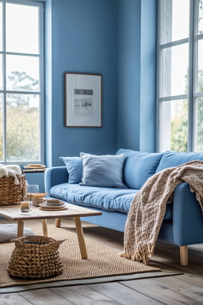 Envision soft blue walls paired with natural pine or oak furniture—think a simple sofa with wooden legs and a low-profile coffee table. Textured textiles like chunky knit throws and woven rugs add tactile warmth. Light filters through large windows, bouncing off pale wood floors that stretch across the room. Minimalist art or sculptural decor in neutral tones keeps the look clean. The overall vibe is serene, airy, and welcoming.