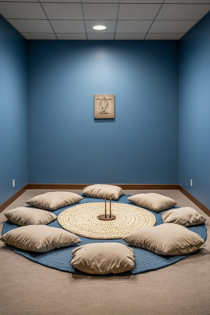 Picture a softly painted blue room with plush floor cushions arranged in a circle or in a cozy corner. The floor is layered with textured rugs in neutral tones, providing comfort underfoot. Gentle, indirect lighting—like wall sconces or candles—casts a warm glow. The space is free of clutter, with only essential, calming decor like a simple statue or a small water feature. It’s a haven that invites breathing, reflection, and quiet.