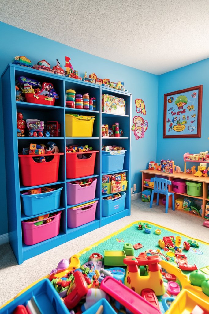 19. Bright Blue Kid’s Playroom with Colorful Storage Solutions