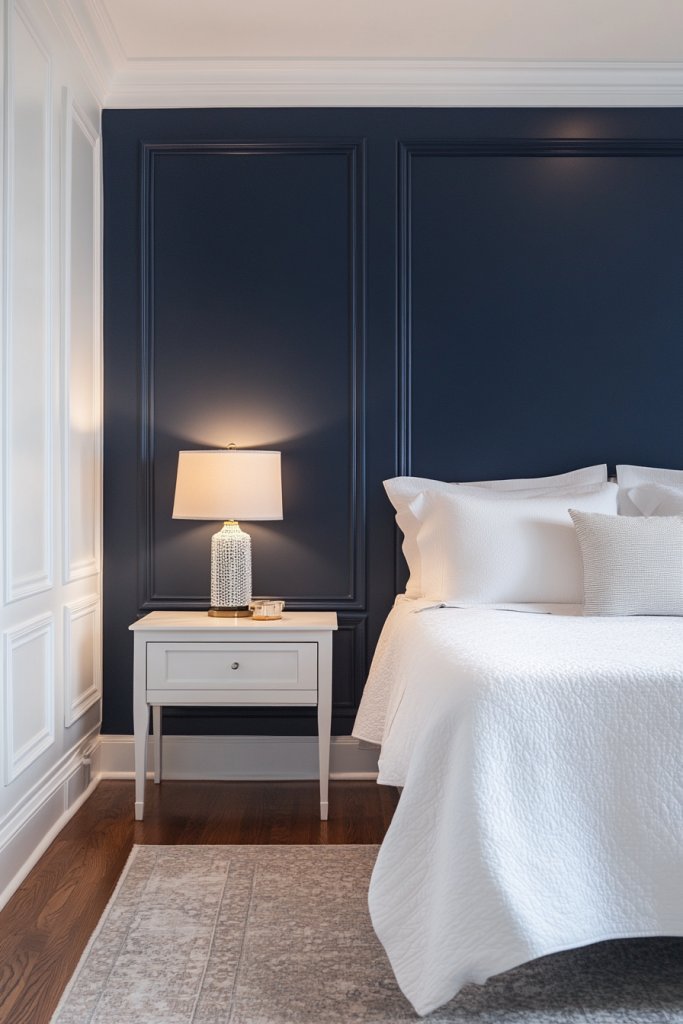 Picture a deep navy wall contrasted with bright white trim framing it perfectly—clean lines that immediately draw your eye. The rich hue adds a sense of intimacy and luxury, especially when paired with crisp white bedding or furniture. Layer in some metallic accents or minimalist decor for a contemporary look. The combination of dark and light creates a striking visual that’s both bold and balanced.