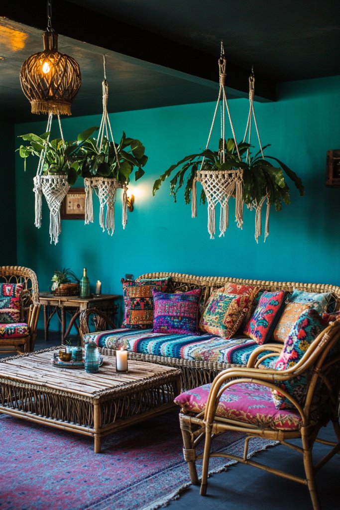 Begin with turquoise wall paint or wallpaper, then bring in rattan furniture—think chairs, stools, or a daybed. Mix and match textiles with varied patterns and textures, but keep within a cohesive color palette. Use natural fiber rugs and layered cushions to add comfort. Light the space with lanterns or string lights—avoid harsh overhead lighting for that cozy, boho feel. Accessorize with handcrafted decor, but steer clear of clutter.