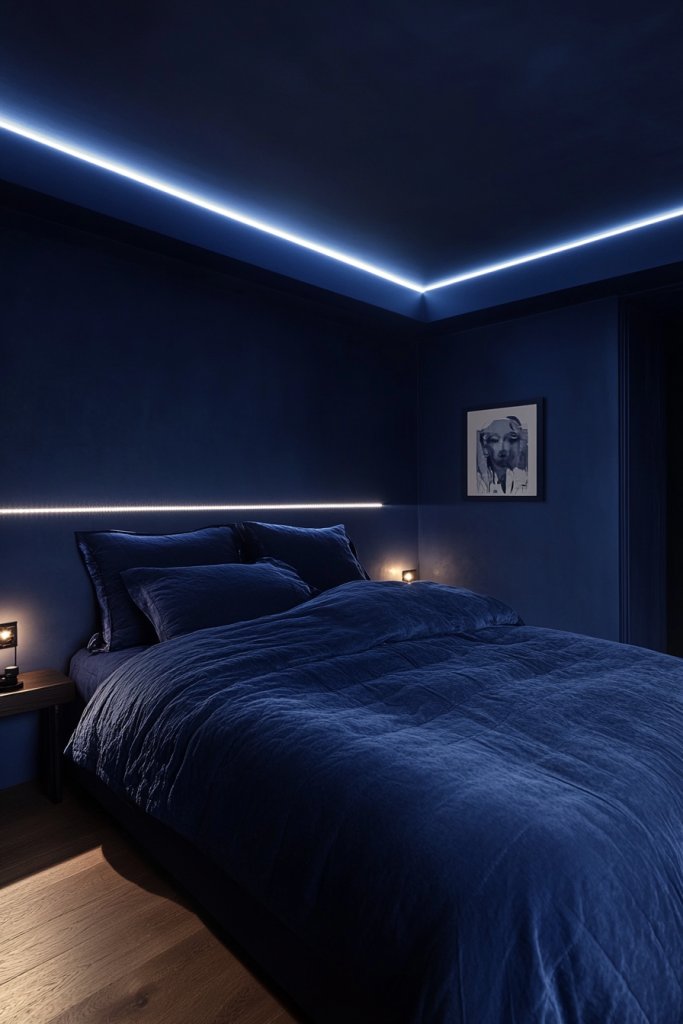 6. Deep Indigo Bedroom with Ambient Mood Lighting