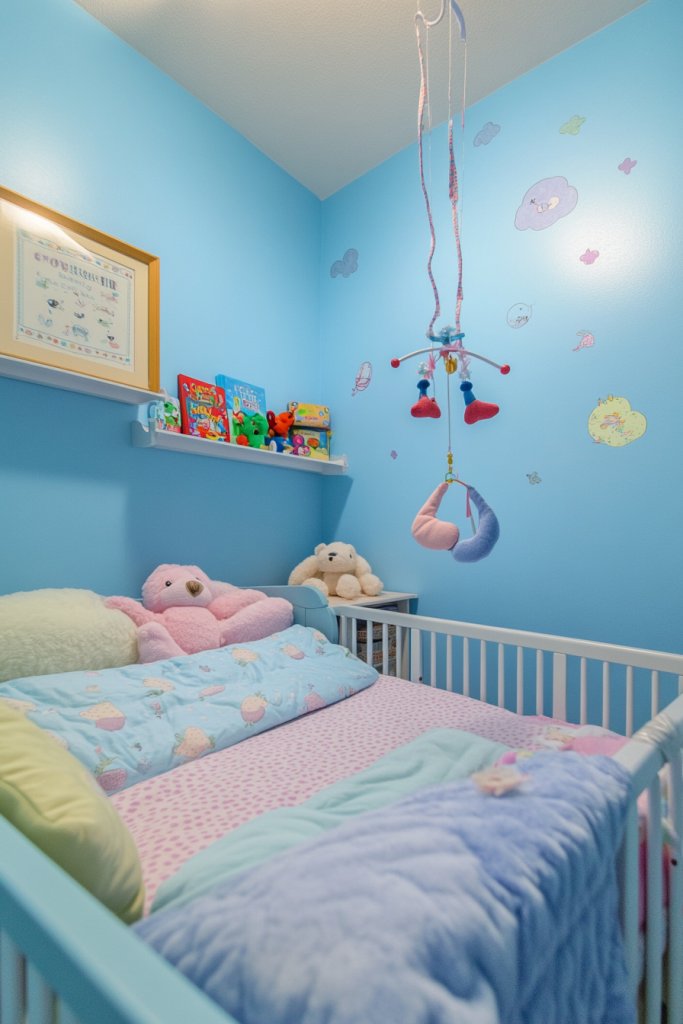 Visualize walls painted in a soothing sky blue, accented with delicate cloud or star decals that inspire wonder. Soft textiles like plush blankets, textured crib bumpers, and gentle curtains in pastel hues make the space inviting. Incorporate playful elements like a mobile with fluffy clouds or a decorative garland that adds personality without overwhelming. The overall effect is a peaceful, dreamy environment perfect for nap time and cuddles.