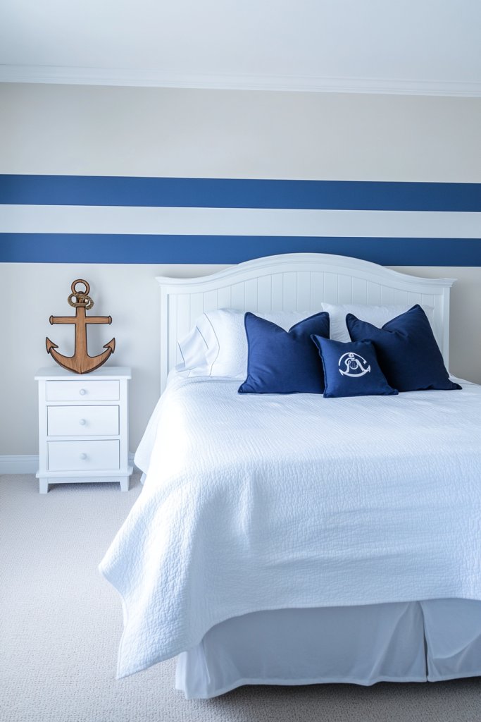 Picture a wall painted with bold, crisp stripes in navy and white, contrasting with simple, neutral furnishings. The stripes evoke the feel of a sailor’s cabin or a coastal cottage, especially when paired with weathered wood or wicker accents. Light-colored bedding and accessories keep the space bright and airy, while a few nautical-themed decor pieces add subtle details. The overall look is cheerful, clean, and endlessly charming.