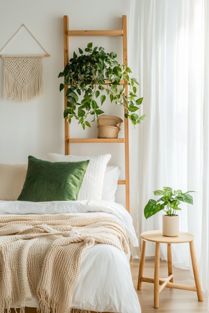 A ladder shelf adorned with trailing plants can instantly elevate your boho bedroom into a lush sanctuary. Imagine this: the warm, rustic wood of the ladder shelf, gracefully cradling cascading greenery that softens the room’s edges.