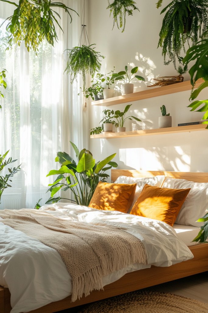 To make your design pop, let some plants hang down while others rest on the shelves, creating depth and movement. This layered effect draws the eye and adds a sense of tranquility. So go ahead, release your creativity, and transform your bedroom into a lush retreat where nature and style coalesce beautifully.