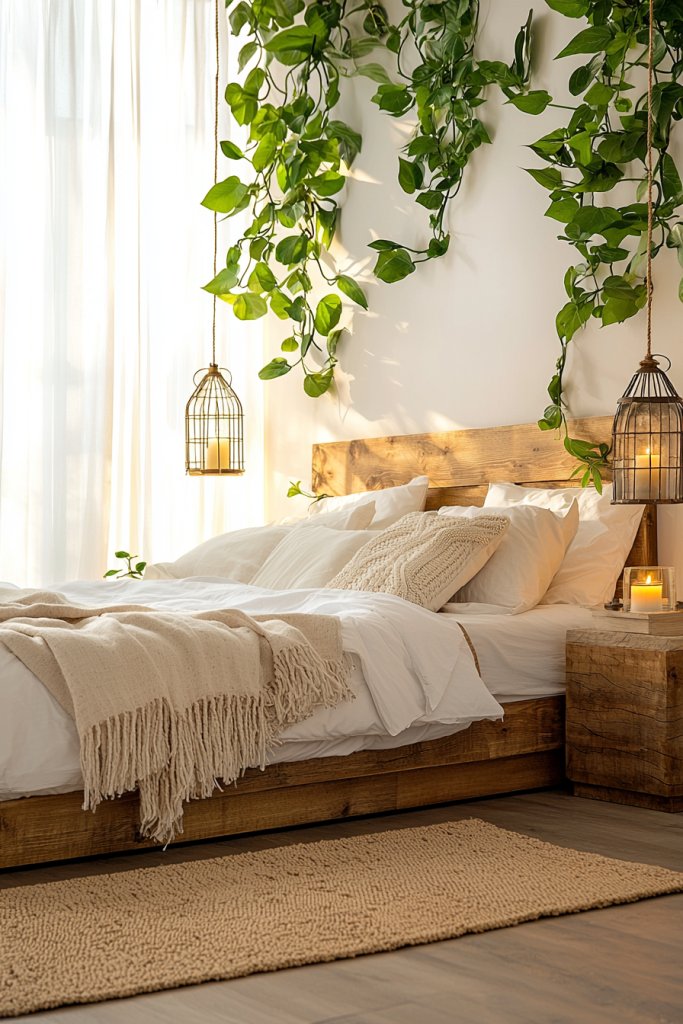 Don’t shy away from creativity; intertwine twinkling fairy lights with your greens for an enchanting glow at night. Rustic wood beams paired with hanging plants effortlessly embody the boho aesthetic, making your bedroom a serene sanctuary you’ll love to retreat to.