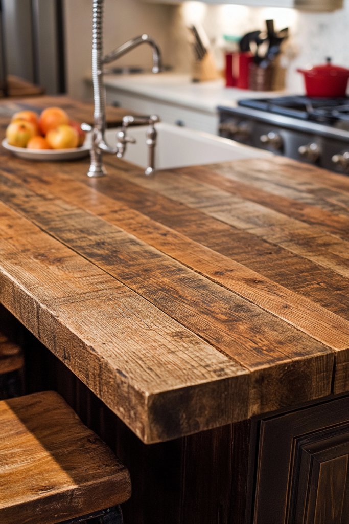 Imagine a countertop with rich, weathered grains and knots that tell a story of old barns and forest adventures. The texture is rugged but refined, with a matte finish that highlights each imperfection as part of its charm. Dappled sunlight dances across the surface, emphasizing the warm, earthy tones that instantly evoke a rustic countryside home. It’s like bringing a piece of nature straight into your kitchen.